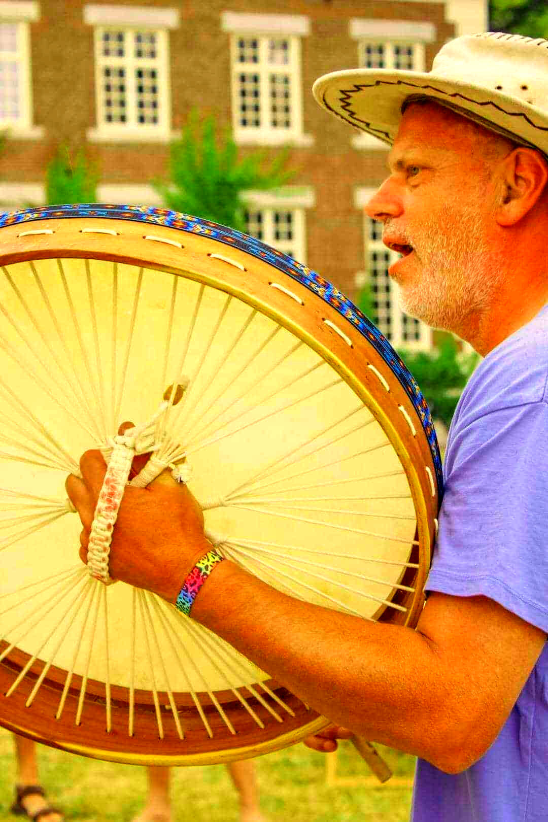 "Marc heeft zeer veel keuze aan dierenvellen, kleuren van stof en andere versieringen. Hij verrasste mij door een paardenstaartje aan mijn trom te maken. In zijn vrijgevigheid kregen we er nog een ratel bovenop. Momenteel gebruik ik mijn drum als oceandrum, door er kleine steentjes in te leggen. Klinkt ook heel goed!"