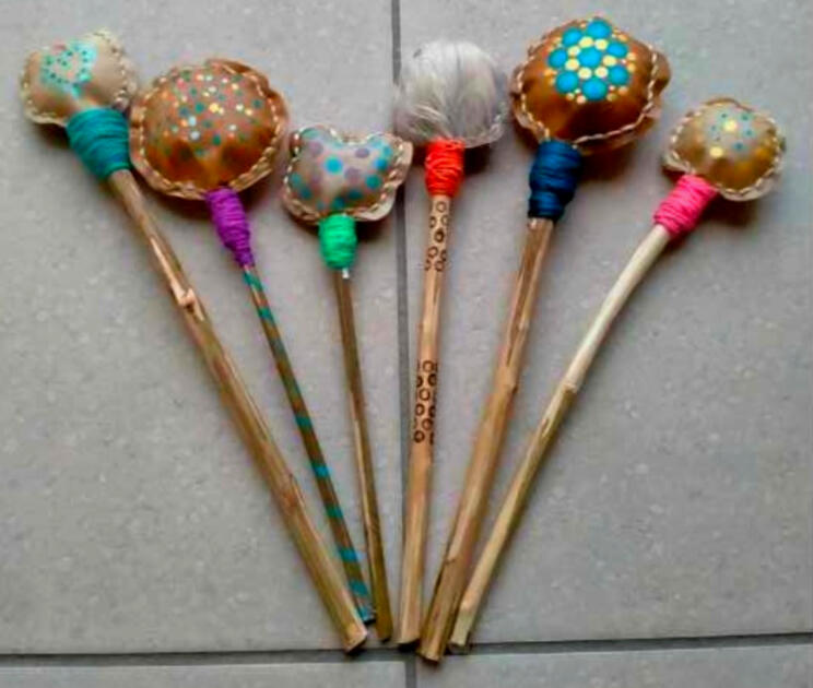 Rateltjes worden gemaakt van restjes huid, die gevuld worden met kleine kralen en op een stokje worden gelijmd. Hierdoor ontstaat er een ratelend geluid.Het wordt gebruikt bij klankbelevingen en healings. Soms ook in combinatie met drums.